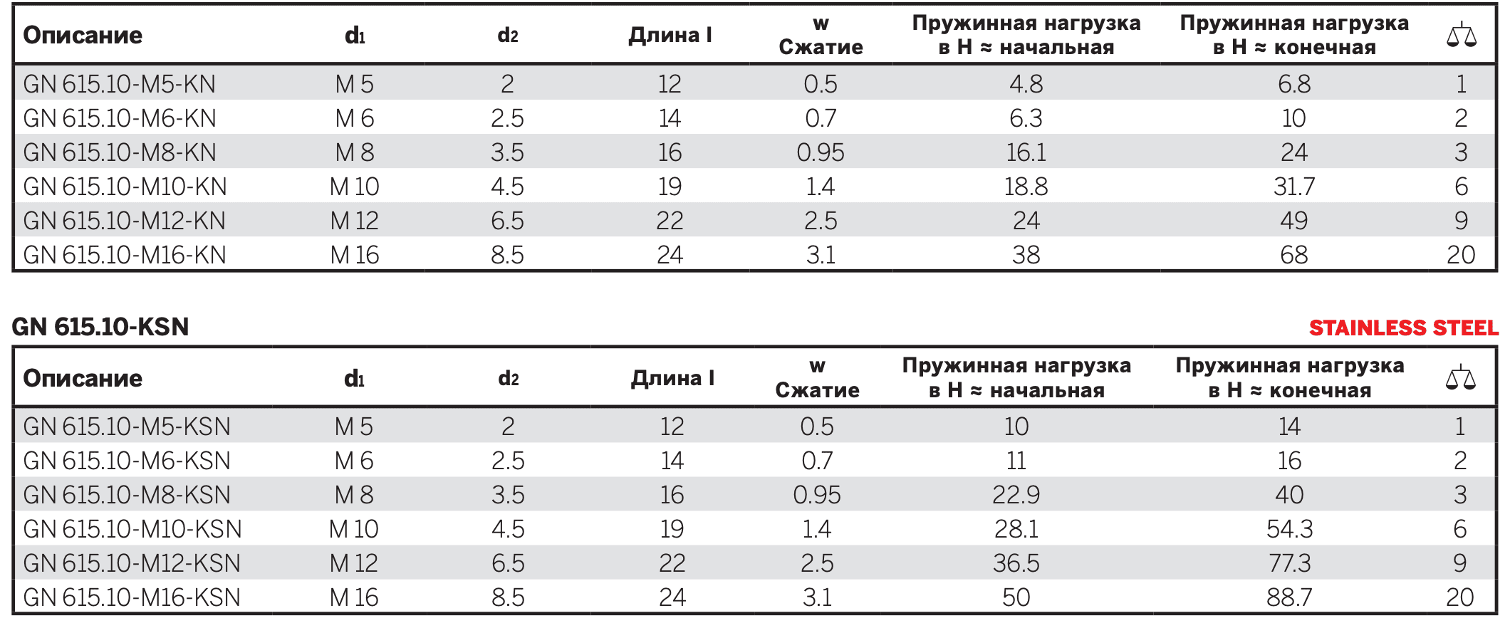 • Тип KN: нержавеющая сталь, стандартная нагрузка пружины
