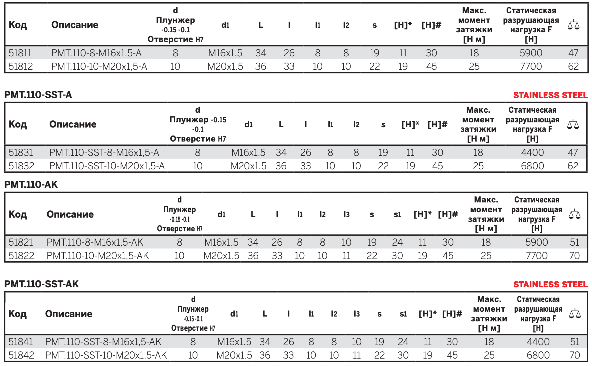 PMT.110-AK:плунжер из стали с черной оксидной пленкой, с контргайкой (поставляется в разобранном виде).