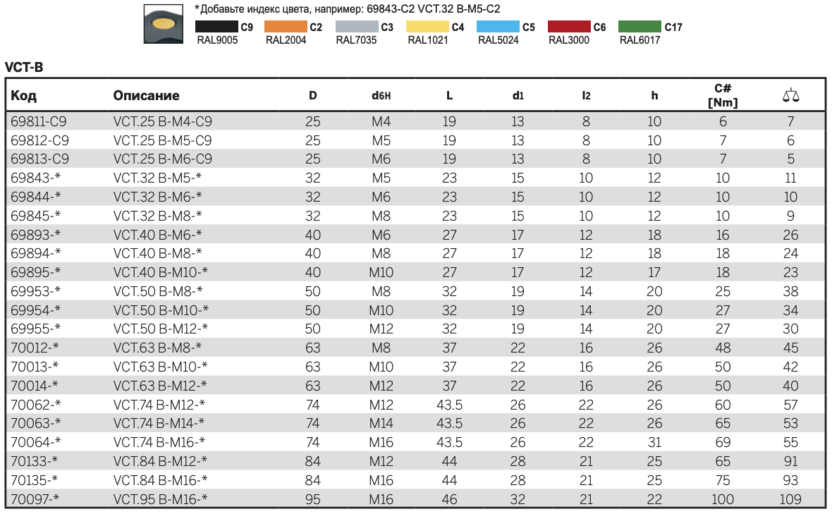 VCT-B: втулка из латуни с глухим (VCT.25 – 95), либо сквозным (VCT.32 – 40 – 50 – 63 – 74 – 84) резьбовым отверстием.