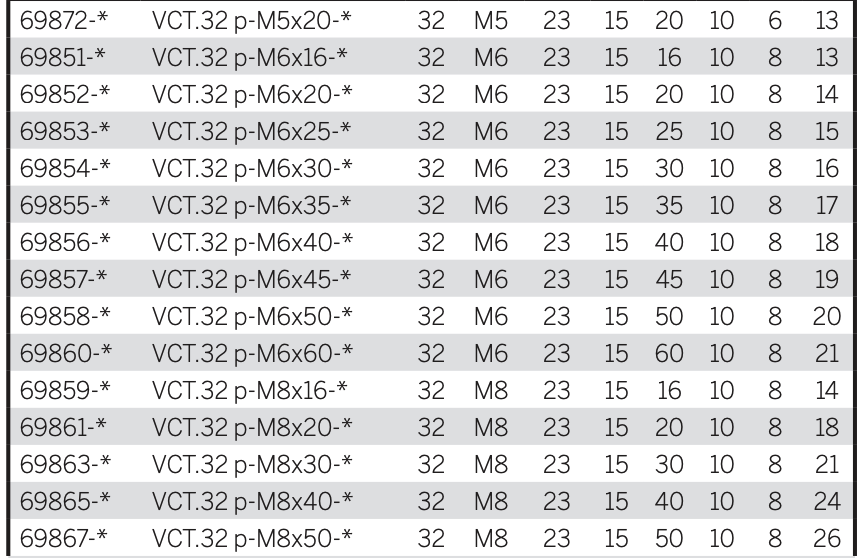 VCT-SST: втулка из нержавеющей стали AISI 303 с глухим (VCT.25), либо сквозным (VCT.32 – 40 – 50 – 63 – 74 – 84) резьбовым отверстием.