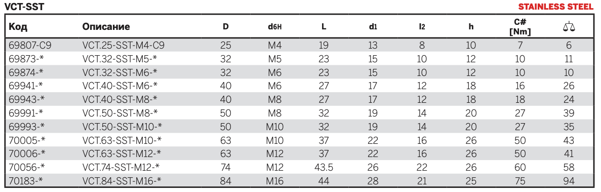 VCT-SST: втулка из нержавеющей стали AISI 303 с глухим (VCT.25), либо сквозным (VCT.32 – 40 – 50 – 63 – 74 – 84) резьбовым отверстием.