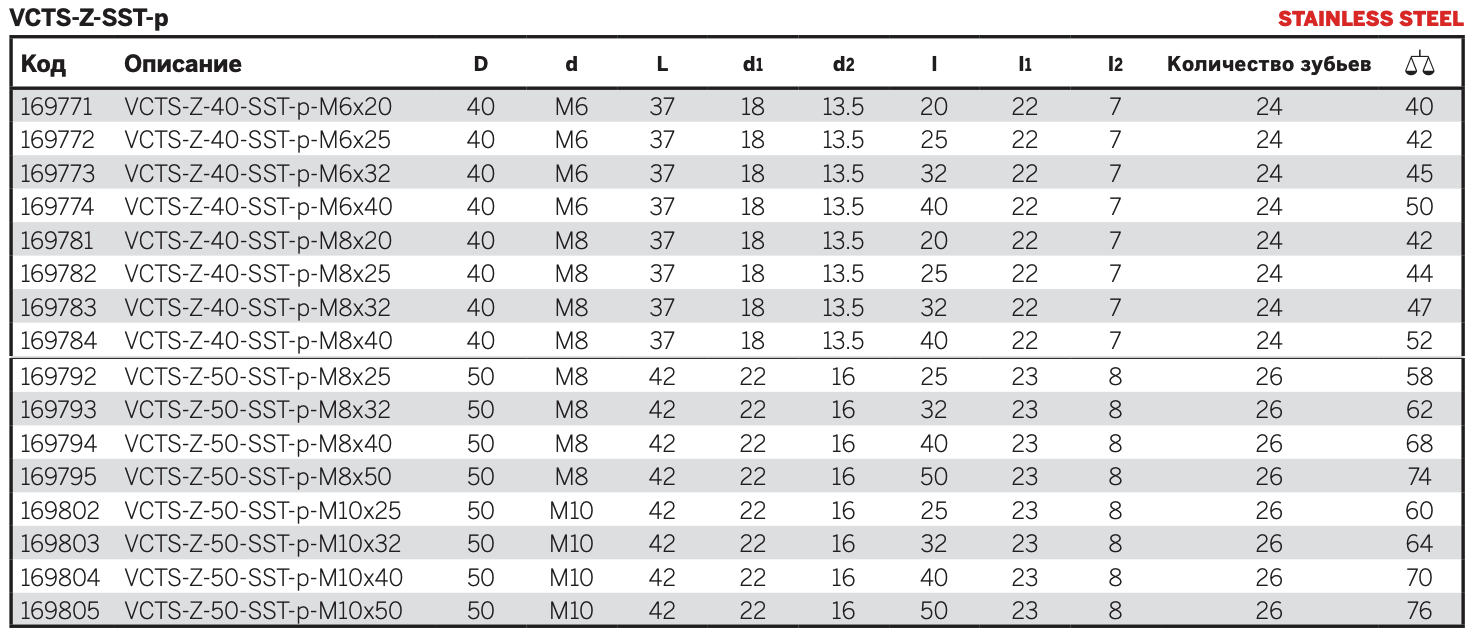 VCTS-Z-SST: прижимной элемент со шпилькой и фиксирующим винтом из нержавеющей стали AISI 303. Возвратная пружина из нержавеющей стали AISI 302.