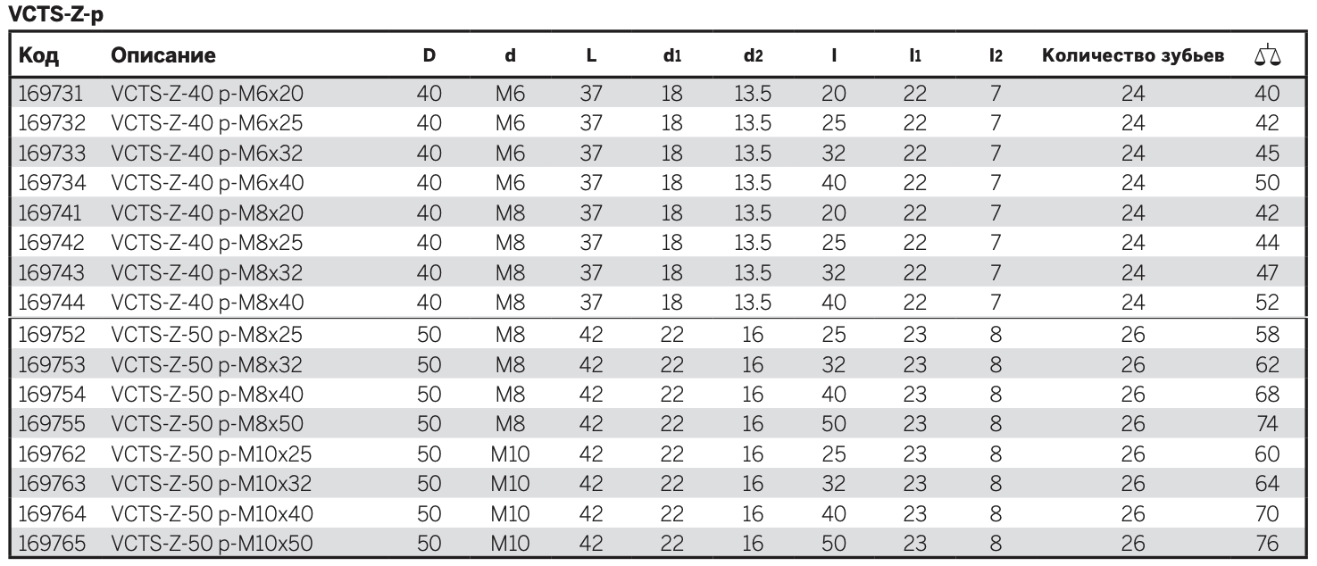 VCTS-Z: прижимной элемент с резьбовым отверстием и фиксирующим винтом из вороненой стали. Возвратная пружина из нержавеющей стали AISI 302.