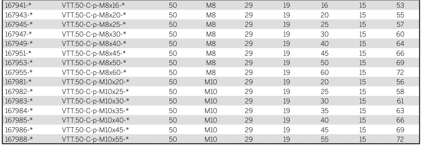 - VTT-C-p: резьбовая шпилька из оцинкованной стали, плоский торец с фаской согласно стандарту UNI 947 : ISO 4753 (см. Технические данные).