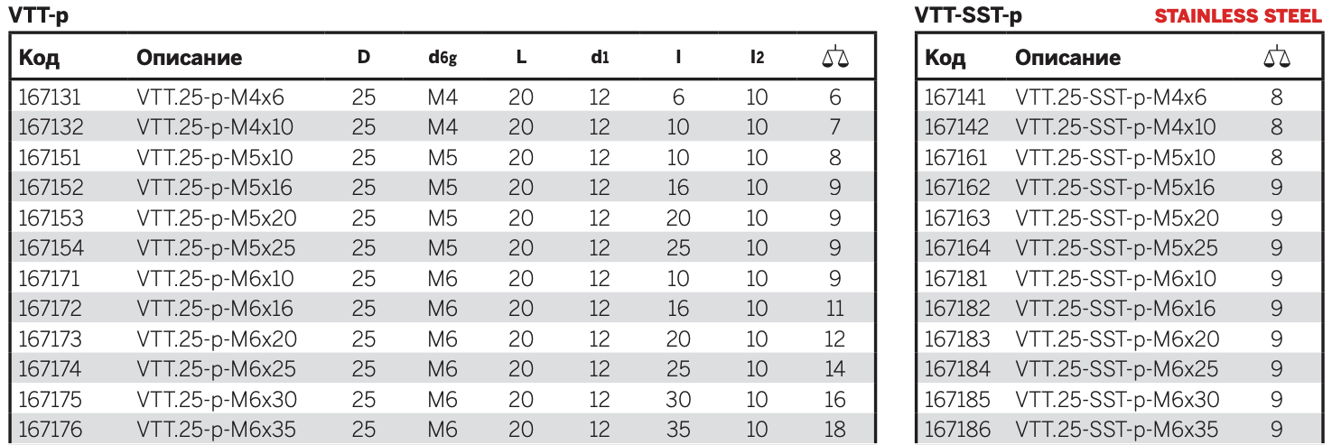 - VTT-SST: втулка из нержавеющей стали AISI 304 с глухим резьбовым отверстием.