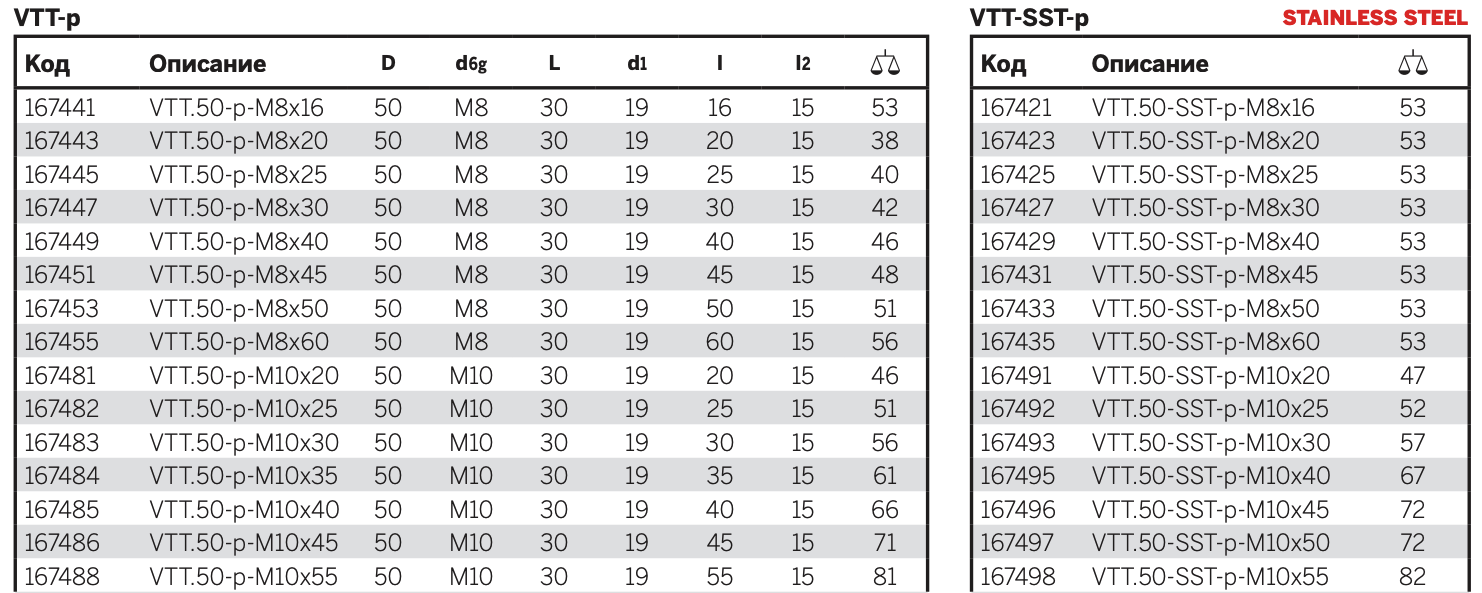 - VTT-SST: втулка из нержавеющей стали AISI 304 с глухим резьбовым отверстием.
