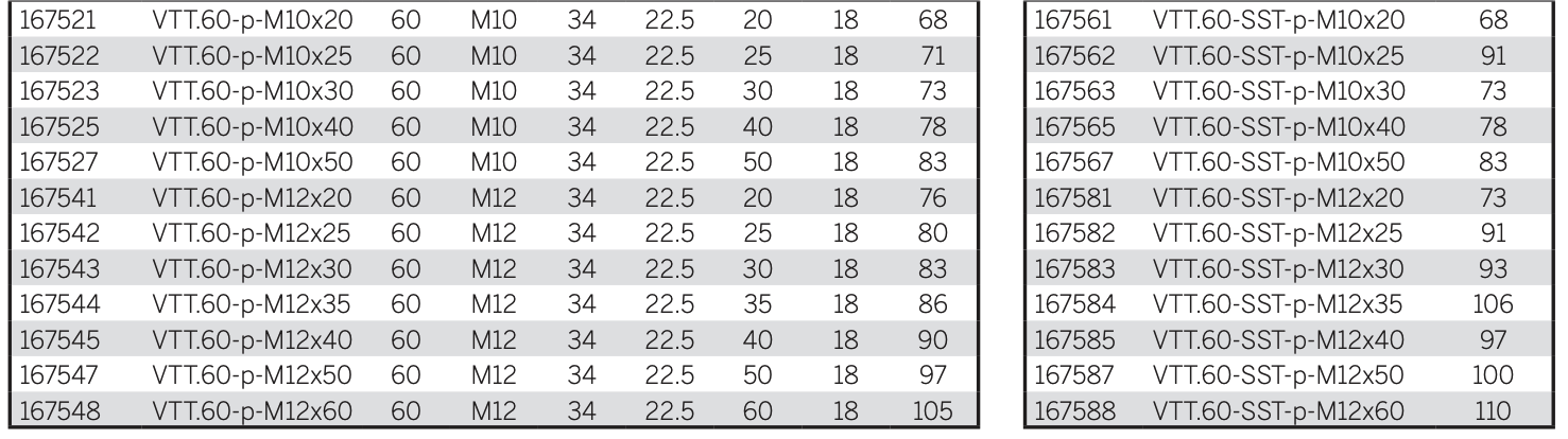 - VTT-p: резьбовая шпилька из оцинкованной стали, плоский торец с фаской согласно стандарту UNI 947 : ISO 4753 (см. Технические данные).