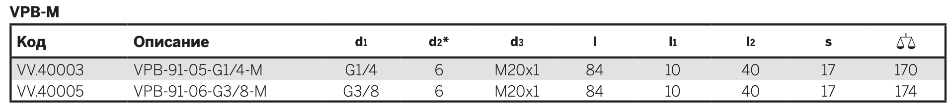 - VPB-M-L: соединение с внешней резьбой и L-образным быстродействующим фитингом.