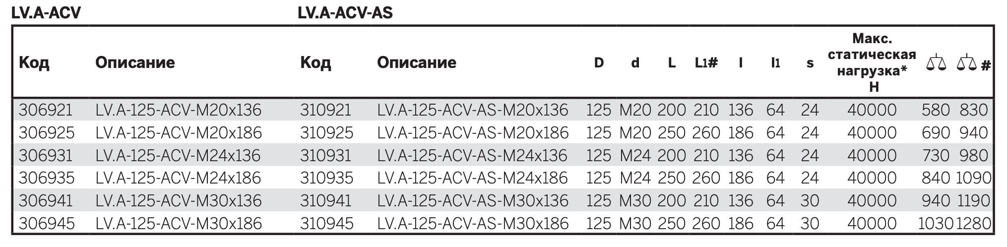 - LV.A-ACV-AS: с противоскользящим диском из бутадиеннитрильного каучука, твёрдость по Шору А 90, поставляется в собранном виде, армирован оцинкованной стальной пластиной, закреплённой с помощью двух винтов.