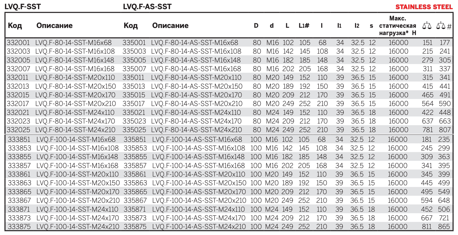 - LVQ.F-AS-SST: с противоскользящим диском из бутадиеннитрильного каучука, твёрдость по Шору А 70, поставляется установленным на основании.