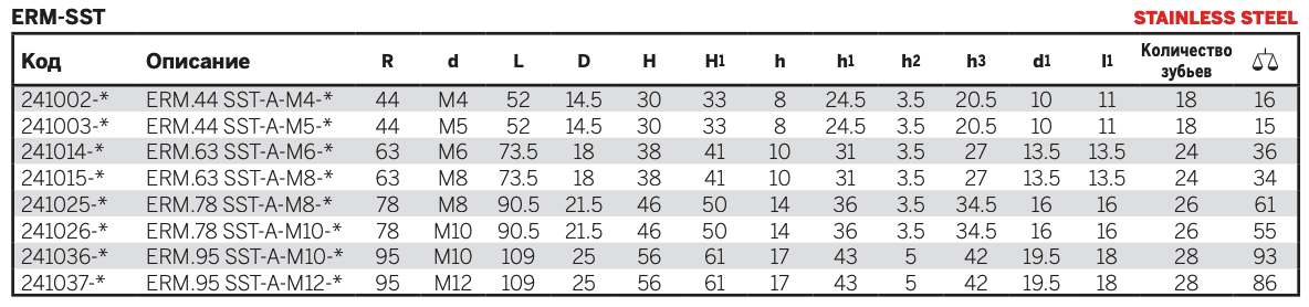 ERM-SST: прижимной элемент из нержавеющей стали AISI 303 с резьбовым отверстием и фиксирующим винтом. Возвратная пружина из нержавеющей стали AISI 301.