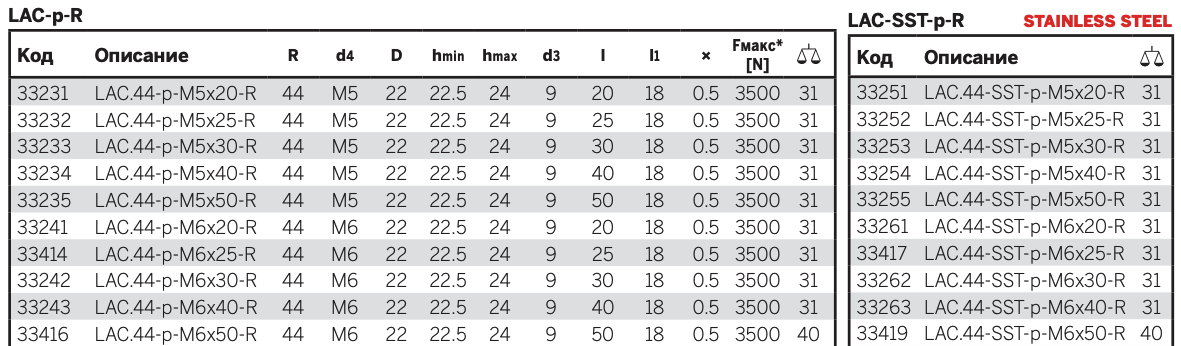 LAC-B-R: позиционирование с помощью регулируемой кольцевой гайки, вращающийся штифт из оцинкованной стали с резьбовым отверстием.