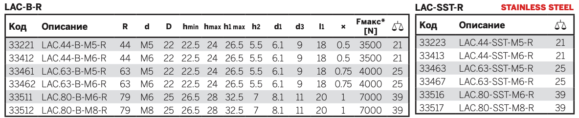 LAC-B-R: позиционирование с помощью регулируемой кольцевой гайки, вращающийся штифт из оцинкованной стали с резьбовым отверстием.