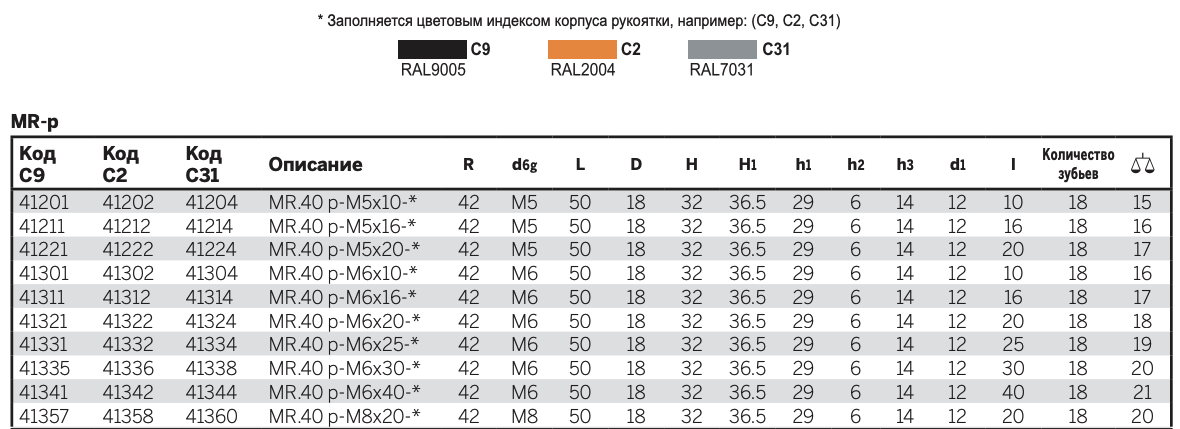 MR-p: резьбовой стержень из воронёной стали с фаской на торце, стандарт UNI 947: ISO 4753 (см. Технические данные). Фиксирующий винт из воронёной стали, возвратная пружина из нержавеющей стали AISI 302.